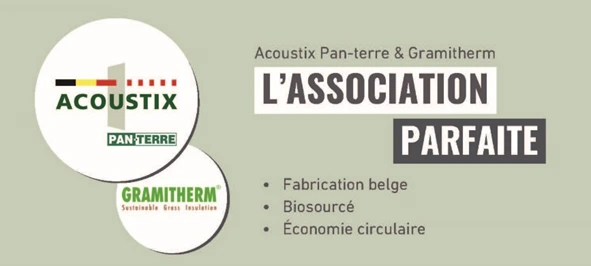 Notre conseil : Les panneaux Pan-terre doivent être combinés avec des isolants complémentaires, tels que le panneau en fibres d’herbe Gramitherm, qui agit comme absorbant. Cela permet de créer une barrière acoustique optimale. En effet, l’isolant est nécessaire comme absorbant, et avoir quelque chose de moins dense entre les plaques de Pan-terre aide à éviter une caisse de résonance. Cette approche complète le travail acoustique et est vraiment nécessaire pour garantir un environnement sonore agréable.
